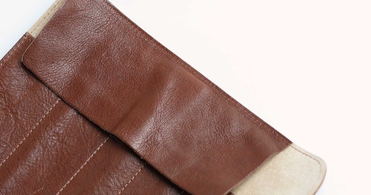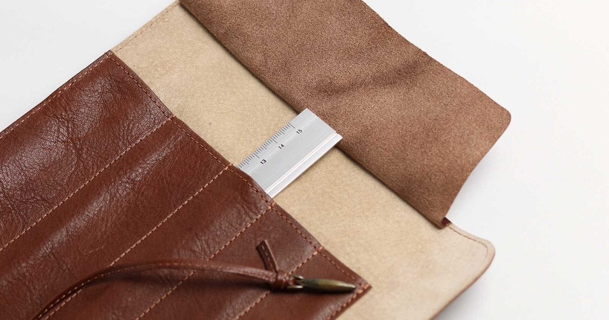 覆蓋上皮革保護蓋後,定規尺的收納狀態如上圖所示。定規尺的長度已達頂端,因此皮革保護蓋的上緣會有些許隆起。這無礙於收納其它筆具。